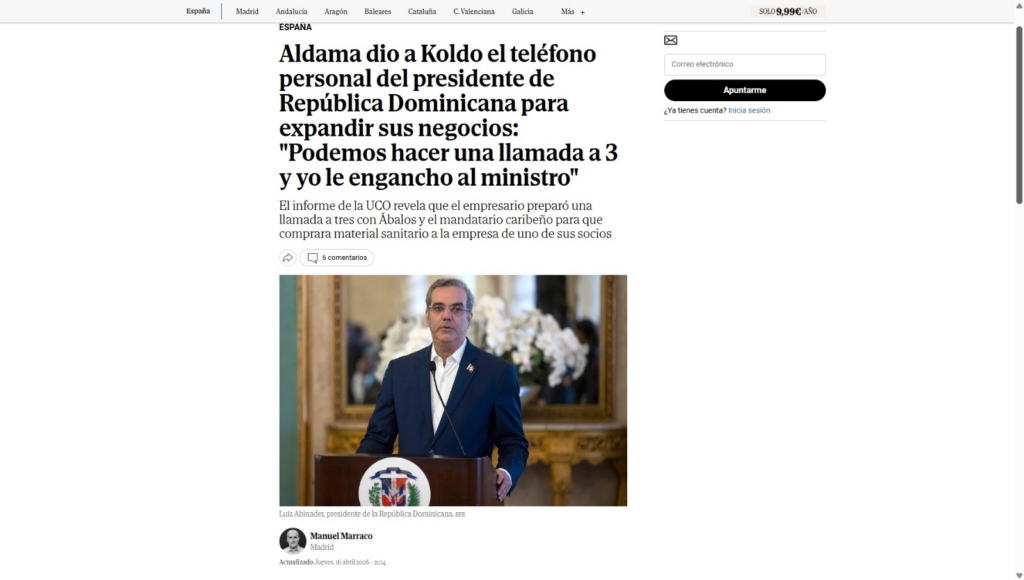 Santo Domingo. – El diario español ABC publicó un trabajo en el que vincula una gestión de Koldo García con un contrato en República Dominicana para un socio de Víctor de Aldama durante la pandemia.