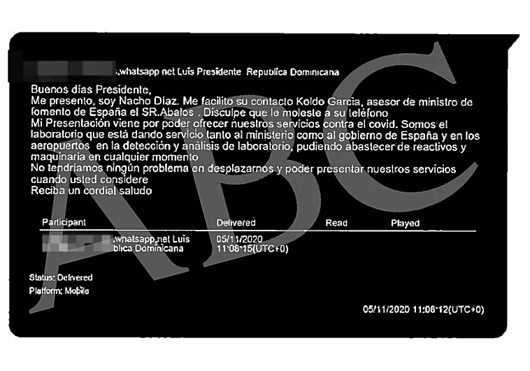 En ese mensaje, según ABC, se presentó como contacto facilitado por Koldo García. Además, ofreció servicios relacionados con el Covid-19, entre ellos análisis, reactivos y equipos.