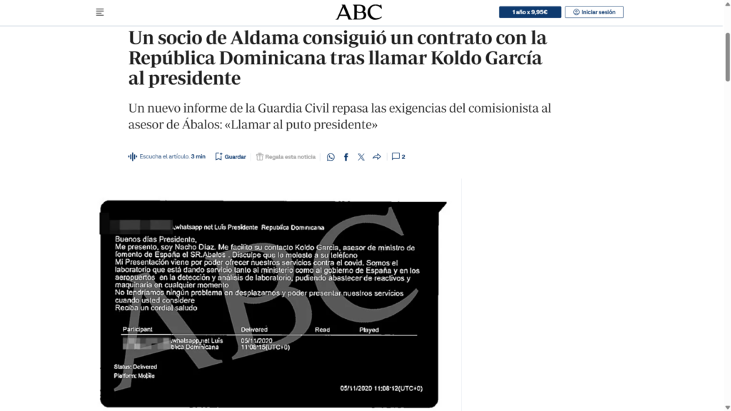 De acuerdo con el trabajo periodístico, Aldama pidió a Koldo García que gestionara una llamada con el mandatario dominicano. En uno de los mensajes citados por ABC aparece la frase: “Llamar al puto presidente de RD”.