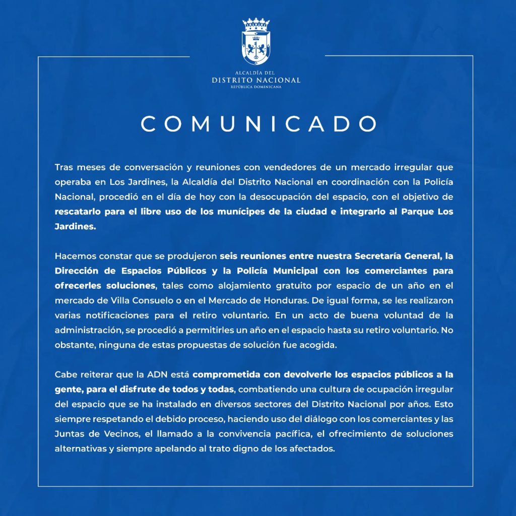 Tras meses de conversación y reuniones con vendedores de un mercado irregular que operaba en Los Jardines, la Alcaldía del Distrito Nacional en coordinación con la Policía Nacional, procedió en el día de hoy con la desocupación del espacio, con el objetivo de rescatarlo para el libre uso de los munícipes de la ciudad e integrarlo al Parque Los Jardines.