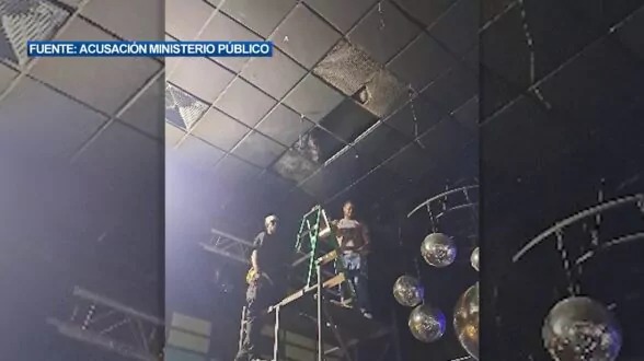 Entre las evidencias citadas figuran imágenes captadas antes del derrumbe, en las que se observa a dos hombres sobre un andamio con una escalera dentro de la discoteca. En ese material también se aprecia el techo sin al menos seis plafones.