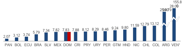 El análisis de los datos de 18 economías de América Latina arroja que la tasa de inflación interanual de la República Dominicana es inferior a la de 11 países de la región. Esto quiere decir que sólo seis países reportan cifras por debajo de la dominicana, de los cuales tres son de economías dolarizadas (Panamá, Ecuador y El Salvador). En el caso de Brasil y México, si bien hoy en día estos dos países exhiben una menor inflación por su postura de política monetaria más restrictiva, también reportaron tasas de crecimiento económico por debajo del promedio para este grupo de países.