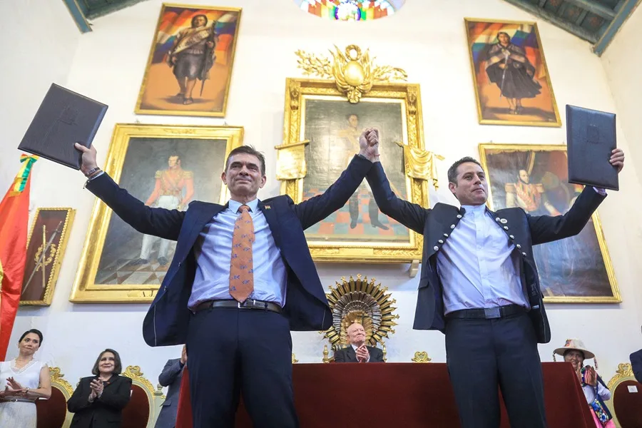 El presidente electo de Bolivia, Rodrigo Paz (i), posa junto al vicepresidente electo Edman Lara este miércoles, en la Casa de la Libertad de Sucre (Bolivia). EFE/ Gabriel Márquez