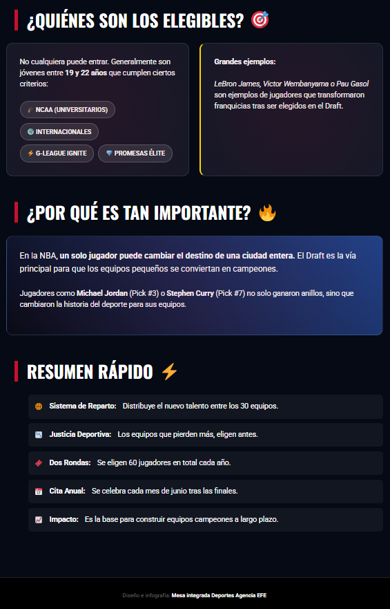 Los Ángeles (EE.UU.) (EFE).- El ‘draft’ de la NBA se llevará a cabo los días 23 y 24 de junio en el Barclays Center de Brooklyn, Nueva York, consolidando el formato de dos jornadas para repartir las selecciones de las 30 franquicias, informó este martes la liga norteamericana de baloncesto.