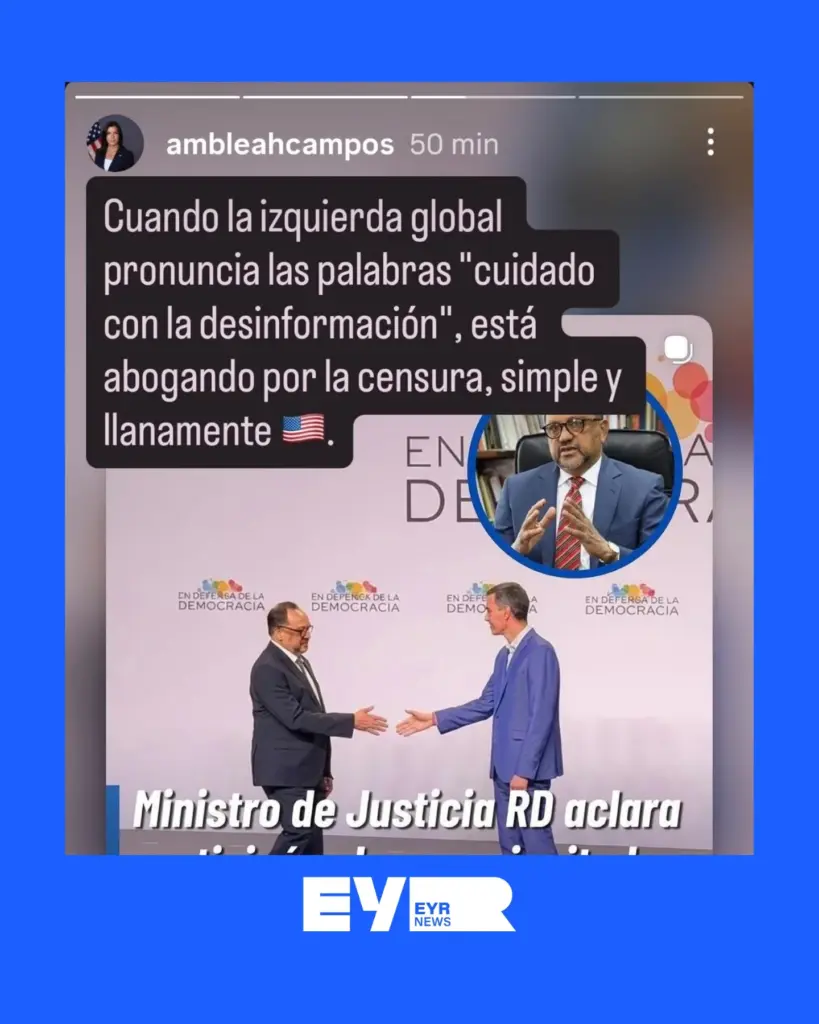 En una de sus historias, Campos escribió: “Cuando la izquierda global pronuncia las palabras ‘cuidado con la desinformación’, está abogando por la censura, simple y llanamente”.