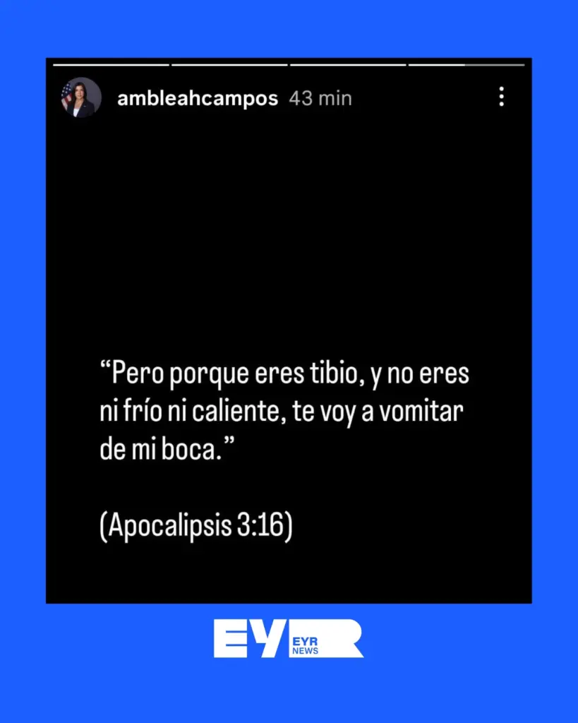 En otra historia, la embajadora difundió la frase: “Pero porque eres tibio, y no eres ni frío ni caliente, te voy a vomitar de mi boca” (Apocalipsis 3:16).