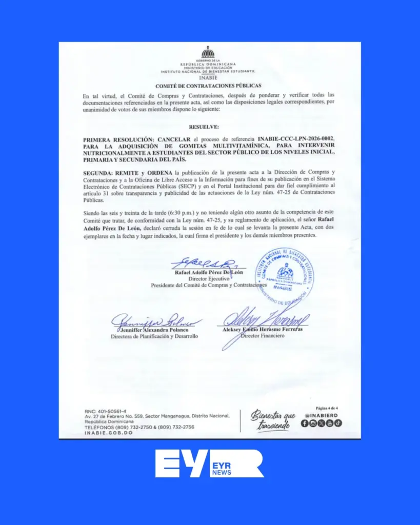 Santo Domingo. – El Instituto Nacional de Bienestar Estudiantil (INABIE) dejó sin efecto un proceso de licitación pública destinado a la compra de gomitas multivitamínicas para estudiantes del sistema educativo público.