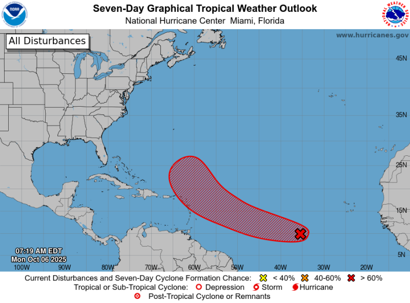 Según el organismo, este sistema atmosférico continúa desplazándose hacia el oeste-noroeste, y aunque por el momento no representa una amenaza directa para la República Dominicana, las autoridades mantienen un monitoreo constante ante cualquier cambio en su trayectoria.