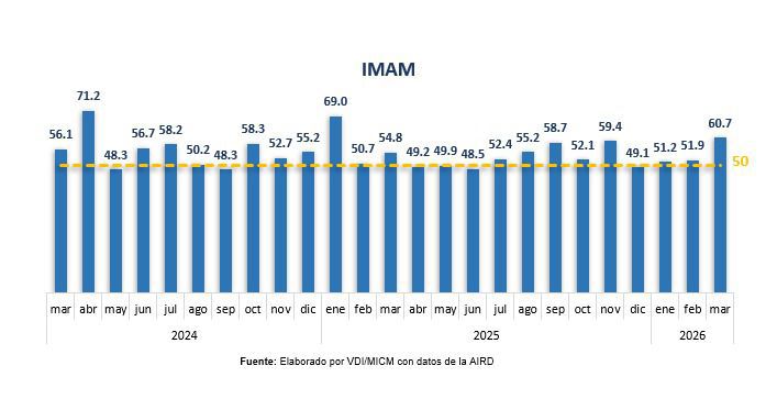 Santo Domingo. – La actividad manufacturera dominicana mostró señales de expansión en marzo de 2026, al registrar 60.7 puntos en el Índice Mensual de Actividad Manufacturera (IMAM), según informó el Ministerio de Industria, Comercio y Mipymes (MICM).