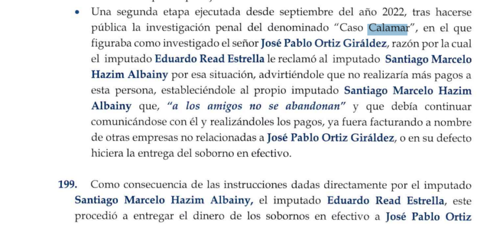 El Ministerio Público detalla que, tras hacerse pública la investigación contra Ortiz Giráldez en 2022, el imputado Eduardo Read Estrella increpó a Hazím por la situación. Según la acusación, Read Estrella insistió en que debían mantener el flujo de pagos hacia Ortiz Giráldez, recriminándole que “a los amigos no se abandonan”.