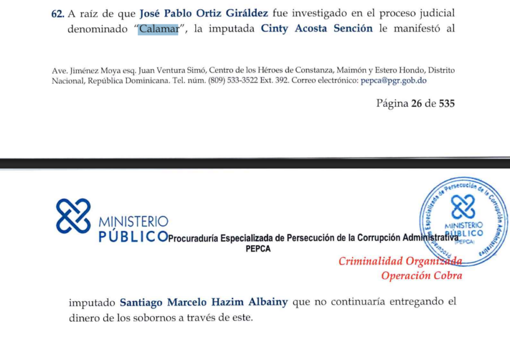 De acuerdo con el documento, la imputada Cinty Acosta Sención decidió dejar de canalizar pagos ilícitos a través de José Pablo Ortiz Giráldez luego de que este fuera incluido como investigado en el proceso Calamar. La acusación sostiene que Acosta comunicó directamente al exdirector de SeNaSa, Santiago Hazím, que no continuaría utilizando a Ortiz Giráldez como enlace para la entrega de los sobornos.