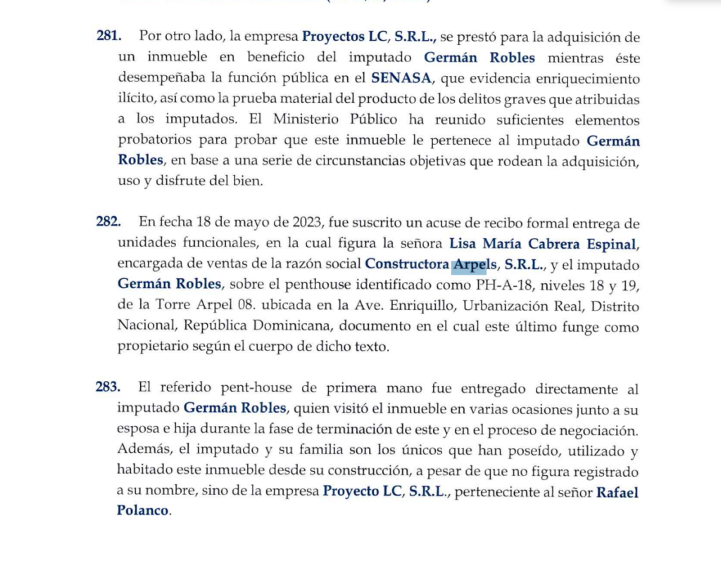 El órgano acusador sostiene que existen múltiples elementos que indican que el penthouse pertenece realmente a Robles. Entre ellos, un acuse de recibo de entrega fechado el 18 de mayo de 2023, en el que el imputado aparece como receptor formal del inmueble.