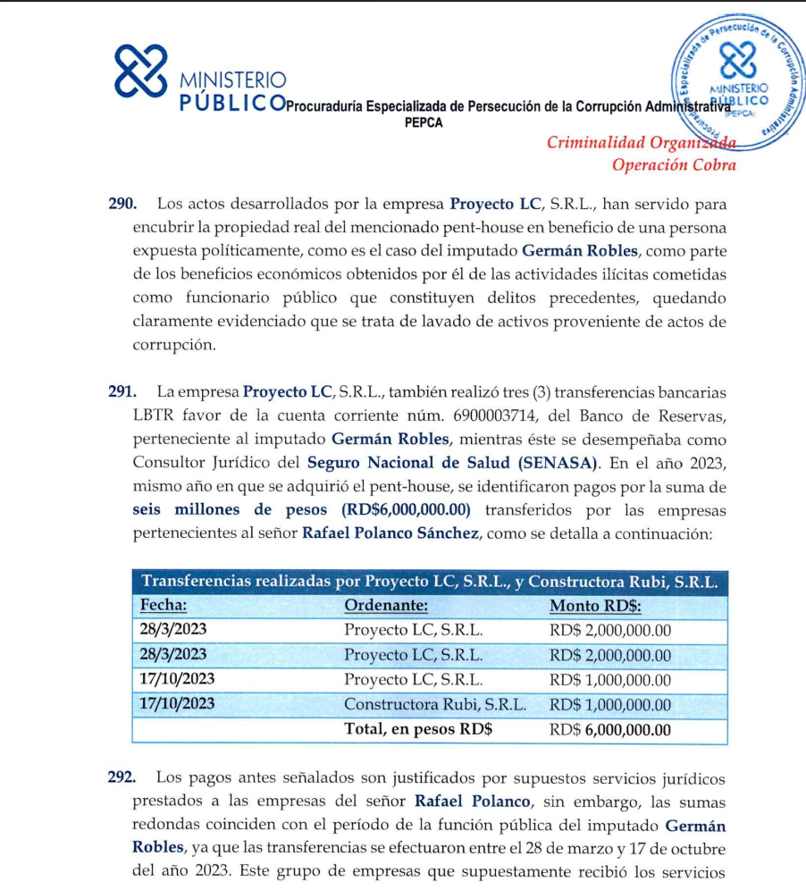 De acuerdo con la solicitud de medida de coerción del caso Cobra SENASA, la empresa Proyectos LC, S.R.L., del empresario Rafael Polanco Sánchez, habría adquirido el inmueble en beneficio del imputado, pese a que formalmente figura a nombre de dicha compañía.