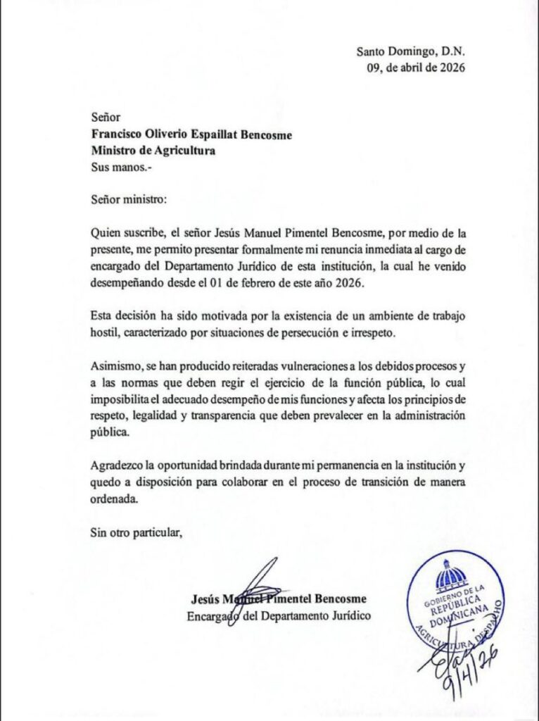 Santo Domingo. – El encargado del Departamento Jurídico del Ministerio de Agricultura, Jesús Manuel Pimentel, presentó su renuncia al cargo que ocupaba desde el 1 de febrero de 2026, según una comunicación dirigida al ministro Oliverio Espaillat Bencosme.